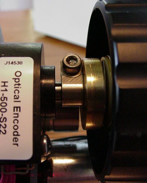 3.) Locate the adjustment bar, the motor drive, and the brass clutch plate. Remove the vertical adjustment screws, 4/40 x 1/4 hex screws, which are located at the rear of the ASI fine focus motor drive (see figure 2b). Use the 7/64 Allen wrench to loosen the clamp that is located on the ASI drive shaft. This clamp is located at the end of the drive shaft as it protrudes out of the black encoder cover (see figure 3). Once the clamp is loose slide it back towards the encoder and slide the brass clutch plate onto the ASI drive shaft. The clutch plate should slide onto the drive shaft with the milled out portion pointing away from the encoder. While holding the right fine focus knob align the ASI drive shaft with the microscope’s fine focus shaft and slide the ASI drive shaft over the microscope’s fine focus shaft. If you do not hold the right fine focus knob the microscope’s fine focus shaft may be pressed over towards the right of the microscope. If this happens simply push the right fine focus knob in towards the microscope to push the shaft back. Once the drive has been installed, it should be attached to the adjustment bar as shown in figure 2b.