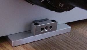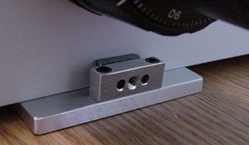 2.) Slide the baseplate assembly completely under the microscope until the small stop plate located on the baseplate is completely against the side of the microscope. This stop plate should be parallel with the bottom of the microscope. Position the base plate so that it is under the focus assembly.
