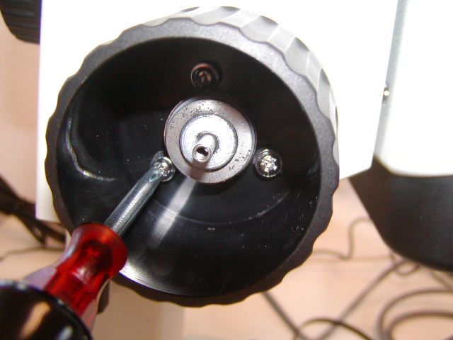 Use a cross blade screwdriver to loosen the three Philip head screws and remove the coarse focus knob as shown in figure 6.