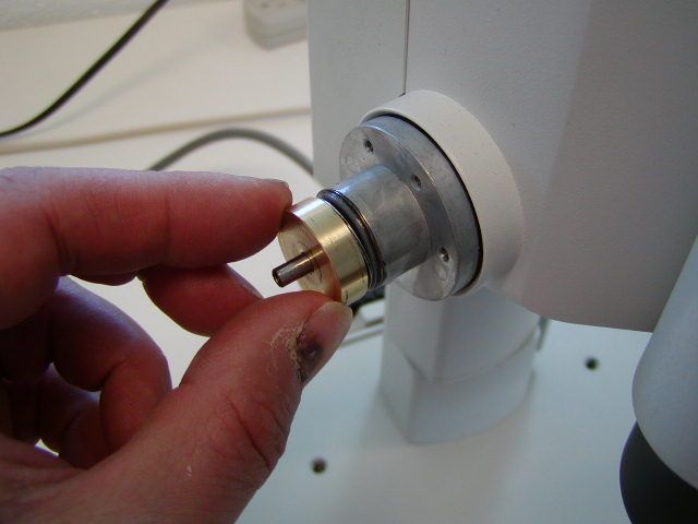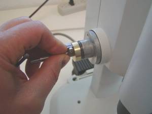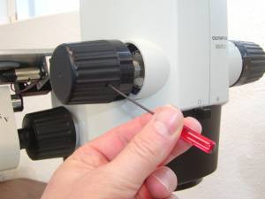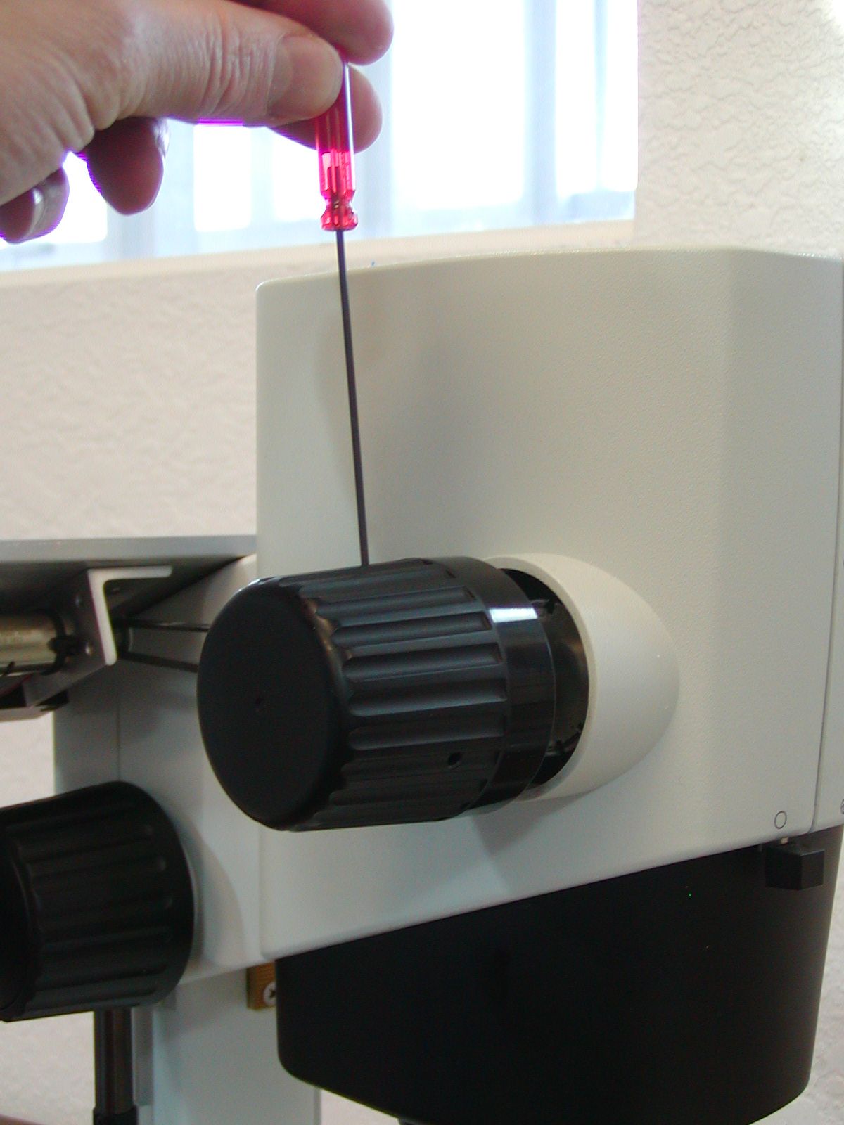 Remove the left fine focus knob from the microscope as follows: