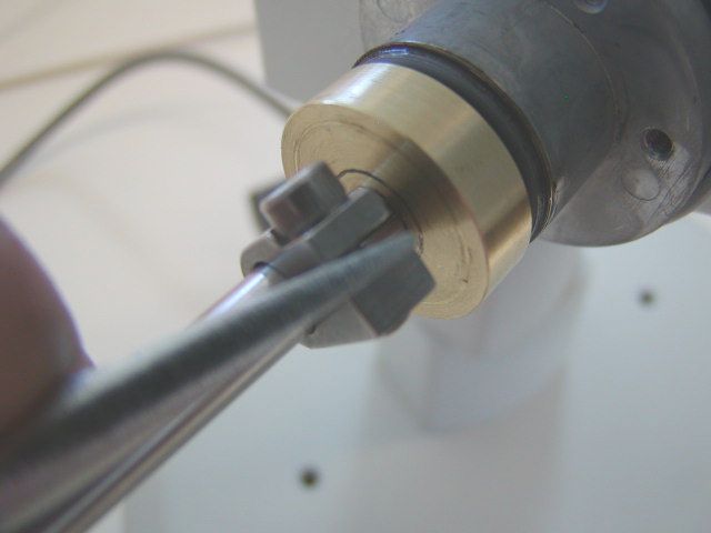 Locate the brass clutch plate & Fine Focus Shaft Extender (FFSE) and install them as shown in the above photos a through d. Note that the clamp & clutch plate must compress the wave washers as shown in photo c. This is done by firmly pressing the clamp & clutch plate against them. You may have to open the clamp up a little bit with a flat blade screw drive as shown in photo d.