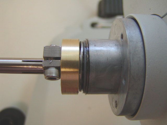Locate the brass clutch plate & Fine Focus Shaft Extender (FFSE) and install them as shown in figure # 7, photos a through d. Note that the clamp & clutch plate must compress the wave washers as shown in figure # 7 photo c, and figure # 8 below. This is done by firmly pressing the clamp & clutch plate against them. Please note; you should insure that the right fine focus knob is presses all the way in against the microscope when doing this. Please also note, that you may have to open the clamp up a little bit with a flat blade screw drive as shown in photo d.