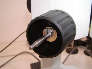 Figure 19. Use the 1.5 mm Allen wrench to loosen the two setscrews that secure the left zoom knob on to the microscope & remove the knob.