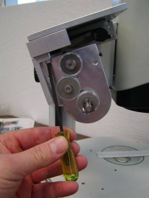 Check the alignment by noting the drag while turning the right fine focus knob. No noticeable drag should be felt at any point with in the full 360 degrees of rotation. If any noticeable drag is felt loosen the Vertical & Horizontal adjustment screws and reposition the drive to a point where no drag is felt. Then hold the drive in place and loosely tighten Vertical & Horizontal adjustment screws.