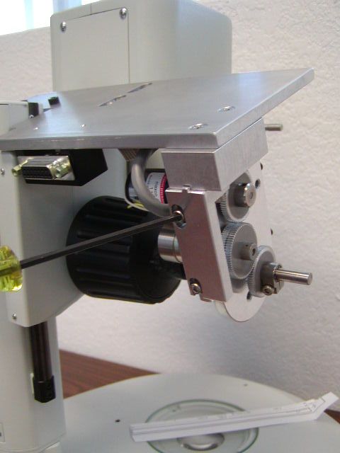 Install the drive assembly as shown. Note that the drive shaft slides over the ffk extender shaft as shown in figure 15. Use the two 4x 10 mm socket head cap screws to secure the base plate to the microscope as shown in figure 16.