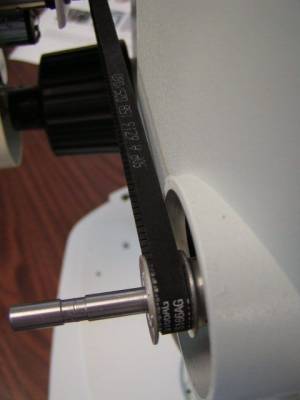 Figure 23. Location of zoom drive gear and belt. Belt is ~ 3 mm ( 1/8 inch ) away from scope body as shown.
