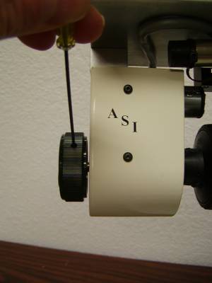 Unscrew the screw that secures the ffk & remove the knob as shown in figure 5. The focus assembly will rise up when the ffk is removed as shown in figure 4. Insure that the two spring washers remained inside of the coarse focus knob as shown in figure 5. If they are stuck to the FFK remove them and place them inside of the coarse focus knob as shown. Store the ffk & 2.5 mm screw that retained it, as they are not needed with the ASI Z-drive.