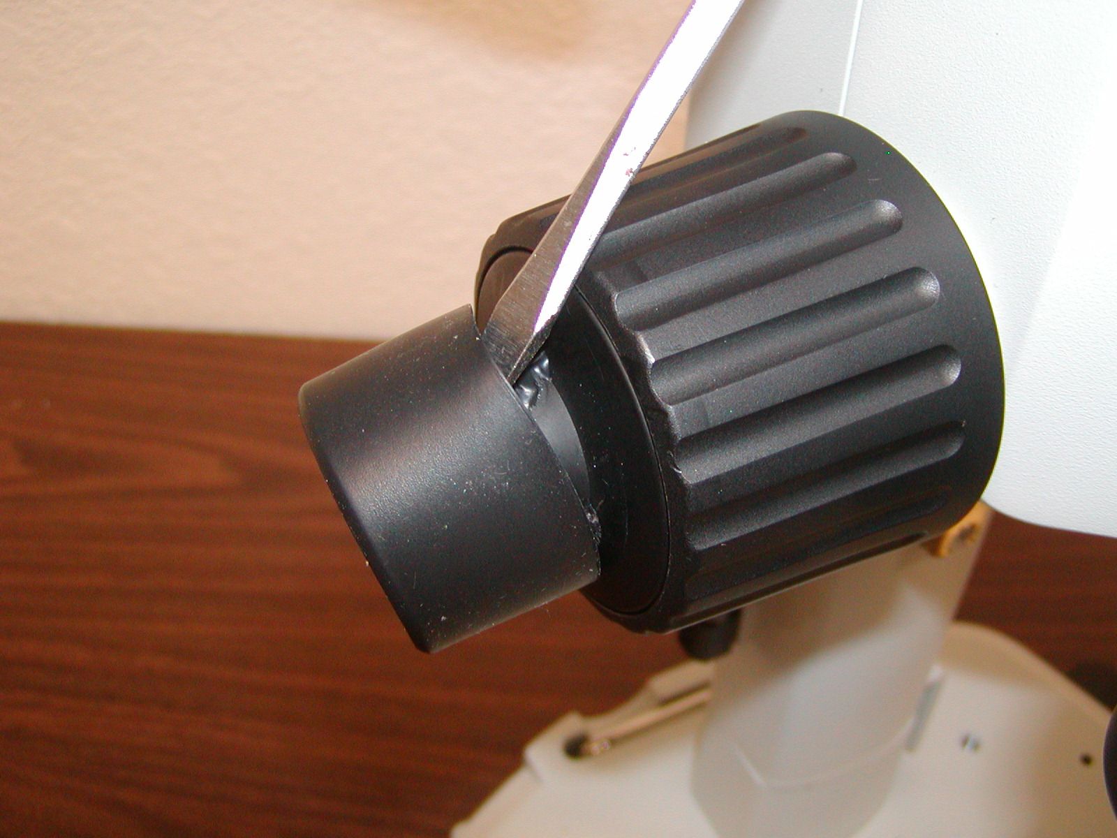 Pry the rubber boot of the end of the left fine focus knob (ffk), on some scopes a screwdriver may be needed to pry the knob off as it may be glued on.