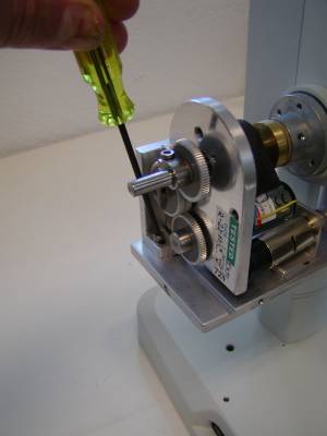 Use a cross blade screwdriver to loosen the three Philip head screws and remove the coarse focus knob as shown in figure 6