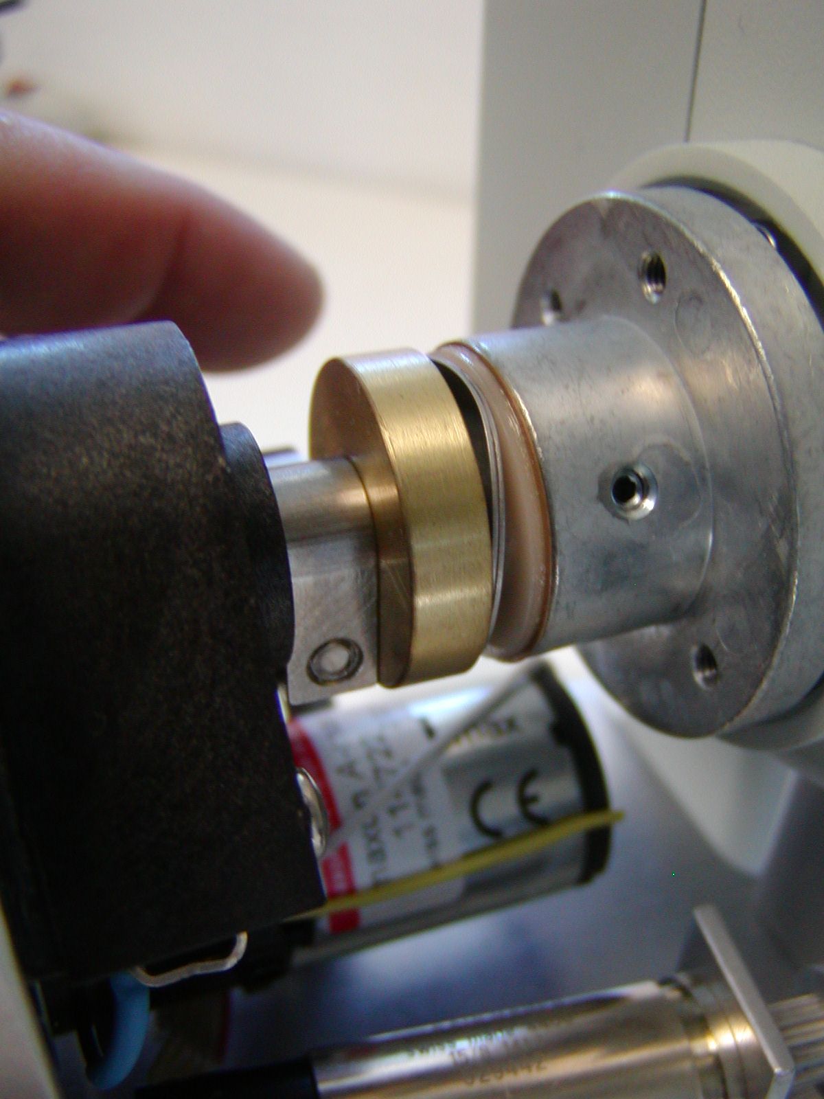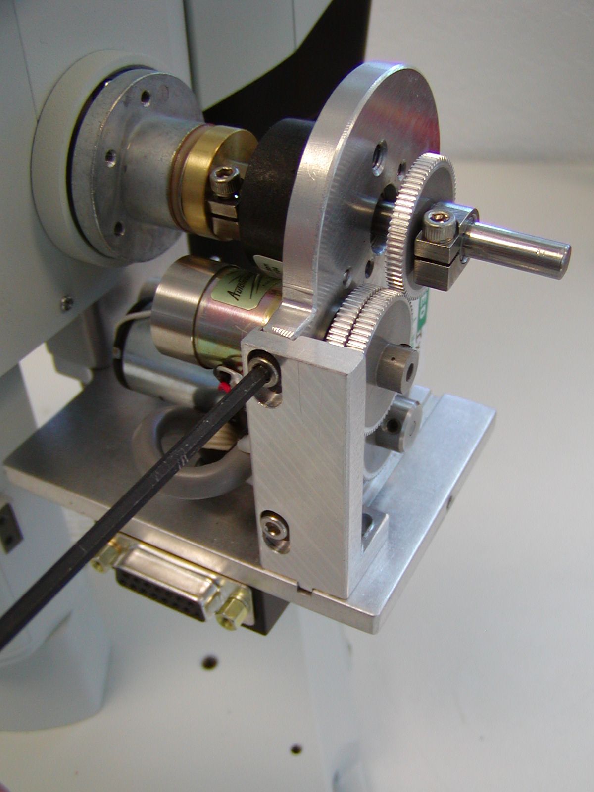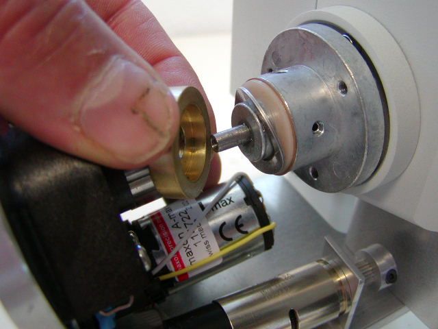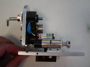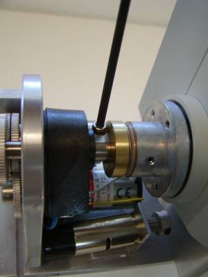 Install the brass clutch plate, and Z-axis drive as shown in figures 17 & 18. The Z-drive adjustment bar has a tab that fits into the grove on the Z-drive base plate. The drive is secured to the base plate with the horizontal adjustment screw that was removed in figure # 11. Please note that it is important that the brass clutch plate compresses the two wave washers as shown before using the 7/64” Allen wrench to secure the drive shaft clamp. Please also note that the drive shaft clamp must be securely tightened to prevent slippage.
