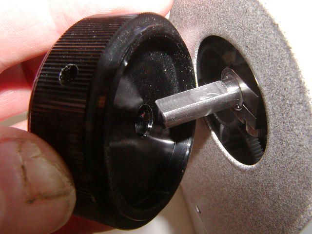 Figure 28b Install left focus knob as shown above. Make certain that one of the two setscrews from the knob mate with the flat on the drive shaft as shown. Use the 1/16” Allen wrench to tighten both set screws.