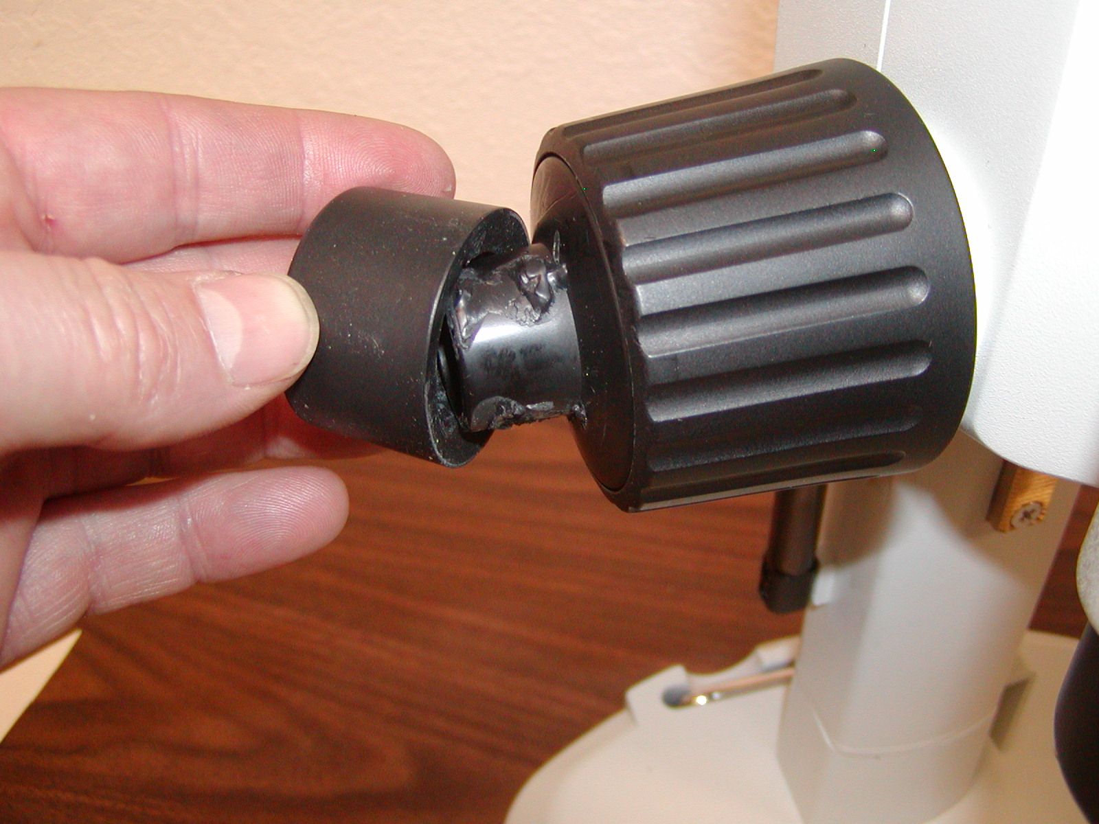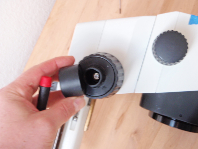 Pry the rubber boot of the end of the left fine focus knob (ffk), on some scopes a screwdriver may be needed to pry the knob off as it may be glued on.