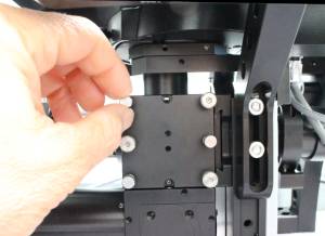 Use the same procedure for the automated filter cube slider. Turn off the controller and manually slide the cube slider to the 1st position. There is a white engraved mark on the slide that should be lined up with the side of the cube housing to accurately position the slider correctly. Turn back on the controller and again, issue a RESET command to the card controlling the slider.