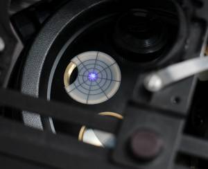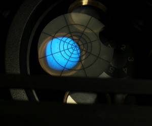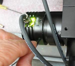 At this point you will be able to manually steer the port switch mirror using the knob on the controller. Use the mirror to bring the illumination spot to the center of the witness target over the objective thread hole. To lock in the zero position for Port 1 of the port switch, simply reset the controller or controller card that is turning the mirror.