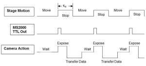 Best performance can be obtained if there is close synchronization between the camera and the stage. A camera that can be externally triggered with a TTL signal allows the stage controller to initiate the exposure command. The stage has the most temporal jitter and uncertainty because of its inherent mechanical nature. Using the stage to trigger image acquisition provides the tightest synchronization. If TTL camera triggering is not possible, then the camera control software will need to poll the stage “Busy” state over the serial interface, or act on the TTL signal from the stage controller to know when to trigger the camera.