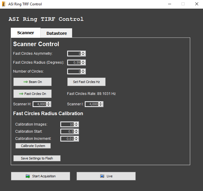 You can run an acquisition to test various fast circles radius parameters. Calibration start is the starting fast circles radius, calibration increment is how much the radius increases per image, and calibration images is the number of images to take. Once you decide on the settings, press the Calibrate System button to start the routine.