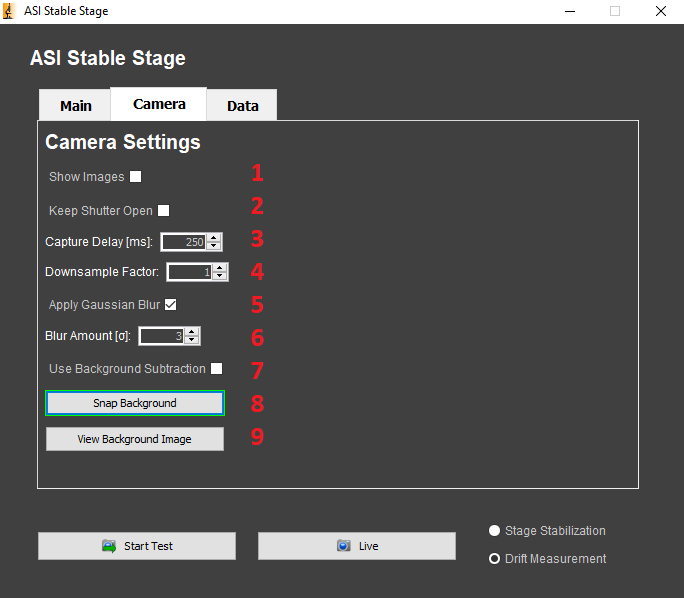 8) Snap Background Image: Snaps an image to use as the background subtraction image.