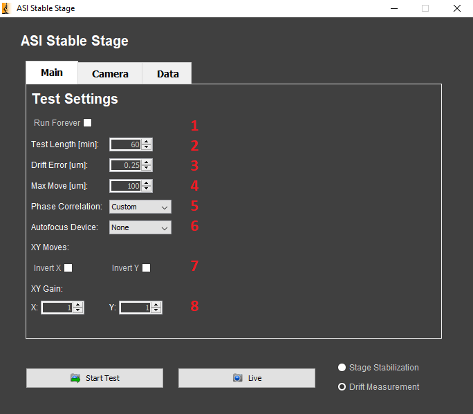 1) Run Forever: Check this box if you would like to run the test indefinitely in Drift Measurement or Stage Stabilization mode.