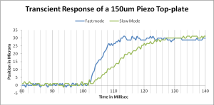 The Above graph is of a 150um piezo top-plate doing a 30um step move in Fast and Slow mode. 10-90% move time is around 10millisec in fast mode, and around 20millisec in slow mode.