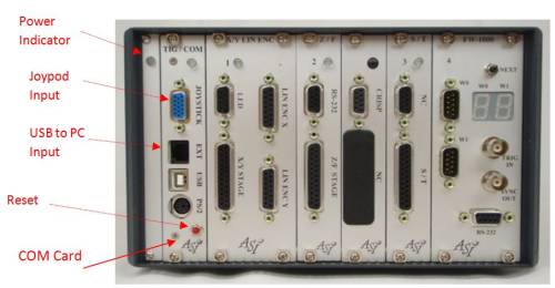 This port allows the attachment of the ASI JOYPOD unit. The joypod unit has an analog joystick, multiple high resolution digital input knobs, as well as several switches and buttons. The COM card monitors the input from the joypod and shares the information to all cards. Several serial USB port commands can be used to set up which cards use the information and what it controls.