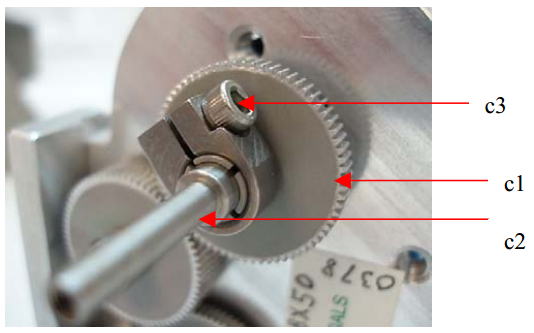 If the clamp on the drive shaft is securely tightened, and no slippage is occurring between the two knobs, then the gears on the motor drive should be checked to insure that the drive shaft of the motor (a), clutch (b), and the drive gear © are not slipping. To do this hold onto the fine focus knob of the microscope while the drive is engaged & turn the command encoder to cause the drive to move; refer to the photos below to insure that the shafts turn with the gears. If the gear stands still while the shaft turns slippage is occurring & the setscrew on the gear will need to be tightened.
