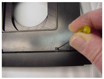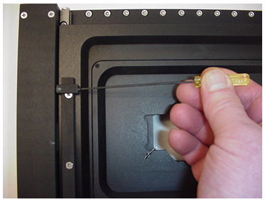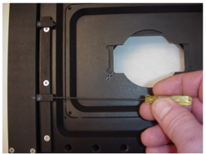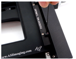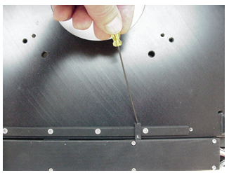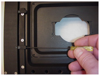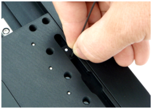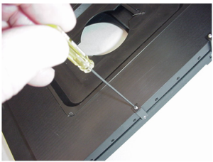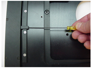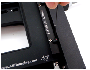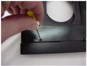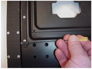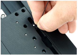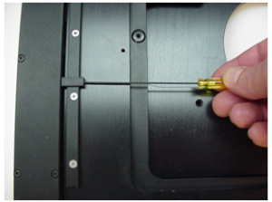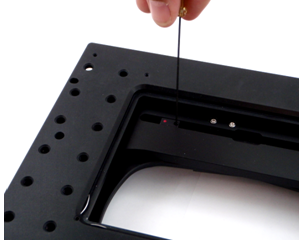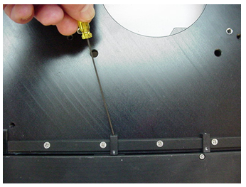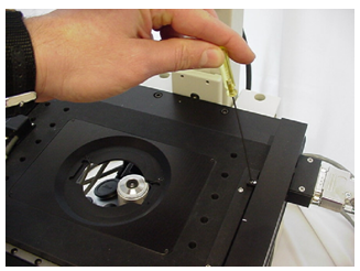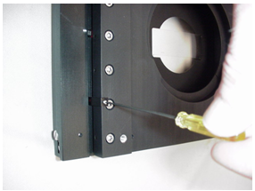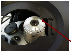 The limit switches are set at the factory to allow the longest range of travel in the X and Y axis. However, the limit switches have been designed to allow you the user to limit the range of travel of the stage. This can be done to prevent the stage from running into the microscope, or parts of the microscope such as the objective shown in the example below. Please note that if you set the limit switches as shown in the example below you will be limiting the stages travel to only scan a 25 x 75 mm slide. This is just an example and the limit switches can be set to cover any range of travel. Please also note that if the limit switches are set such that the stage encounters the mechanical limit of motion before the limit switches are reached the stage does have an over current protection. This is provided only as a safety measure, and the stage can be damaged if the limit switches are not properly set.