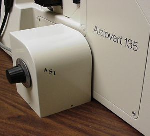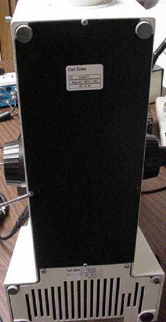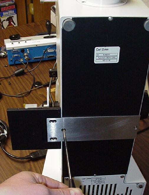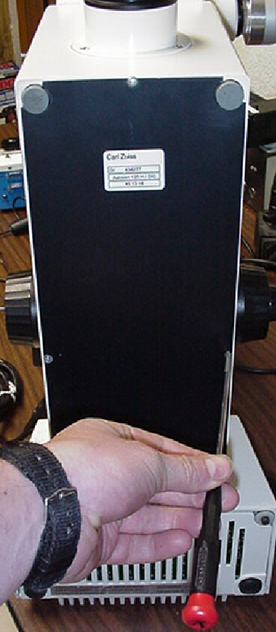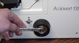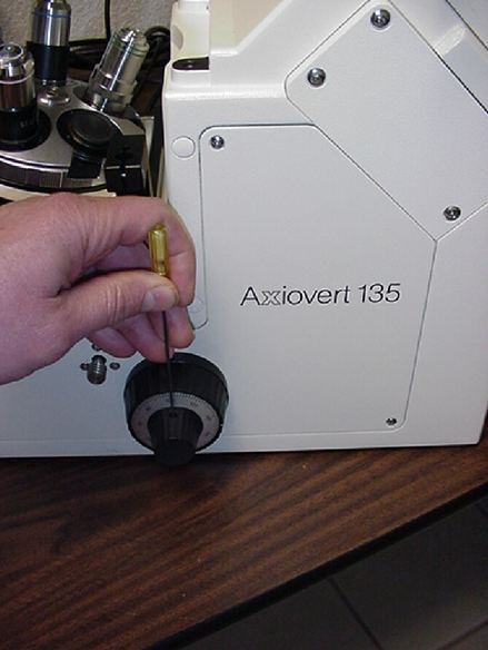 1) This step requires that the microscope be inverted, or raised on its end. Before inverting the microscope, the eyepieces, illuminators, camera, camera tube, tower, and any other components that could be damaged or fall off, must be removed from the microscope. If necessary, refer to your Axiovert manual for instructions on how to remove these items. Briefly, at minimum, the following steps are required: