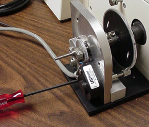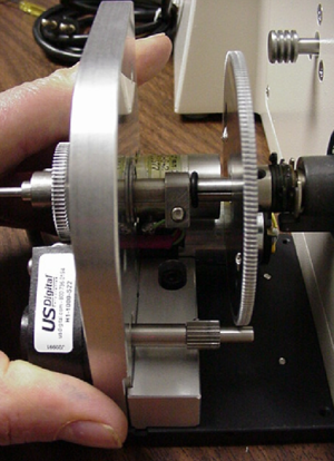 During the next part of this procedure, the drive assembly will be positioned so that the drive shaft slips over the microscope fine focus shaft and the smallest gear of the drive assembly meshes with the large anti-backlash gear.