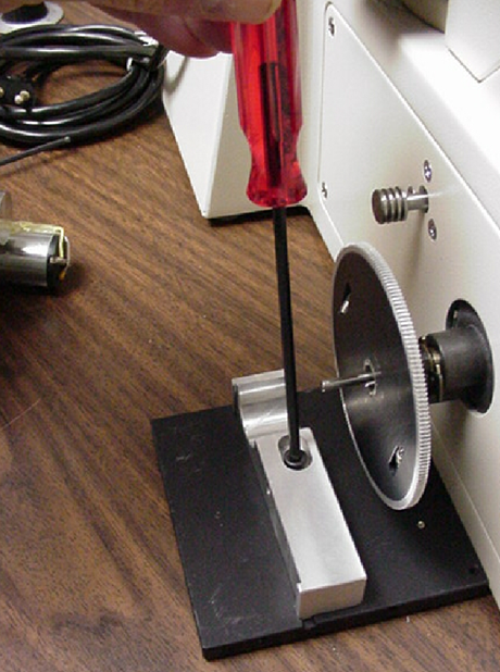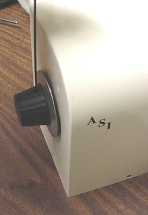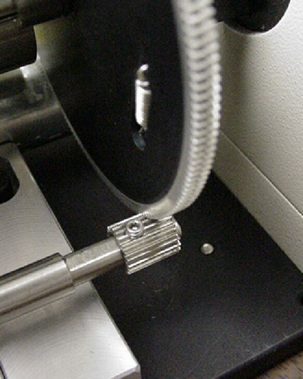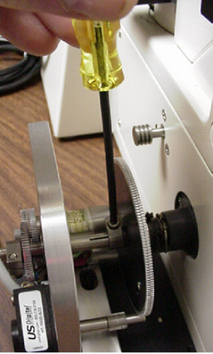 4) Slide the microscope fine focus knob over the shaft extension. Secure it in place by tightening the set screw in the side of the knob using the 0.50 inch hex wrench.