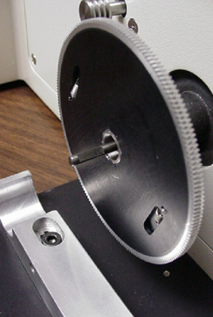 5) Rotate the anti-backlash gear so that the two blackened teeth are visible. Now rotate the gear half that faces towards the microscope so that the two blackened teeth are aligned. Hold the gear halves in this position.