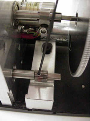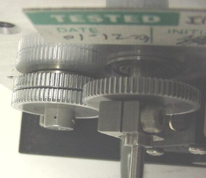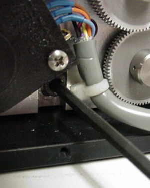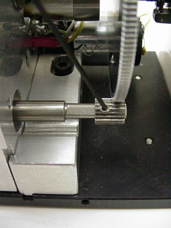 Using the .050” hex wrench, loosen the small setscrew in the small gear below and forward of the anti-backlash gear. Rotate the anti-backlash gear until the black marks in the gearteeth are visible. Rotate the two gear halves so the black marks are aligned. Slide the small gear forward until it meshes with both anti-backlash gear halves then extends beyond them slightly. It may be necessary to rotate the small gear slightly so the gears can mesh. Tighten the setscrew in the small gear.