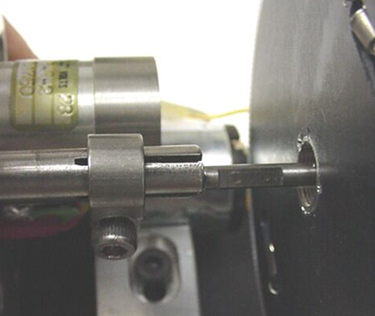While sliding in the drive shaft, maneuver the motor driveplate forward and backward, up and down, until the drive shaft is axially aligned with the fine focus shaft. Slide the drive shaft part way onto the fine focus shaft. Lightly tighten the horizontal and vertical adjustment screws to keep the drive shaft from binding due to tilting of the driveplate, then slide the drive shaft the rest of the way onto the fine focus shaft. When all the way on, the end of the drive shaft should go inside the anti-backlash gear. It will be necessary to rotate the drive shaft as it is being pushed in the last 3mm so that the teeth in the gear clamped to it mesh with the mating gear on the clutch.